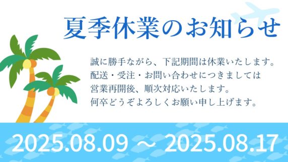 平素は格別のご愛顧を賜り、誠にありがとうございます。誠に勝手ながら、下記の期間を夏季休業とさせていただきます。休業期間2025年8月9日(土)~2025年8月17日(日)※出荷は前後1日ずつ休業です。期間中のお問い合わせやご注文につきまして...