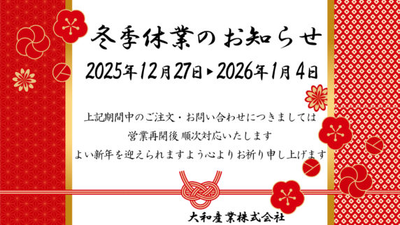 平素は格別のご愛顧を賜り、誠にありがとうございます。誠に勝手ながら、下記の期間を冬季休業とさせていただきます。休業期間2025年12月27日(土)~2026年1月4日(日)※出荷は前後1日ずつ休業です。期間中のお問い合わせやご注文につきまし...